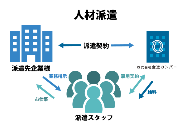 正社員が勤務先と直接雇用契約を結ぶのと異なり、派遣会社と雇用契約を結び、指示を受けて派遣先企業に就業します。あなたに対しての仕事の紹介・給与の支払い・福利厚生等は、当社が責任をもって行います。